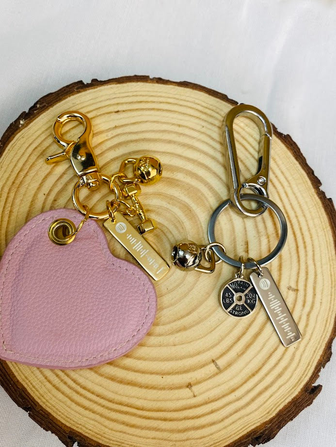 - Llavero dorado: herraje metálico dorado + corazón en cuero vegano + 1 charm con el código spotify de la canción favorita + 1 charm del hobby/pasión compartida (aleación de zinc, aluminio y cobre en baño de oro 24k).